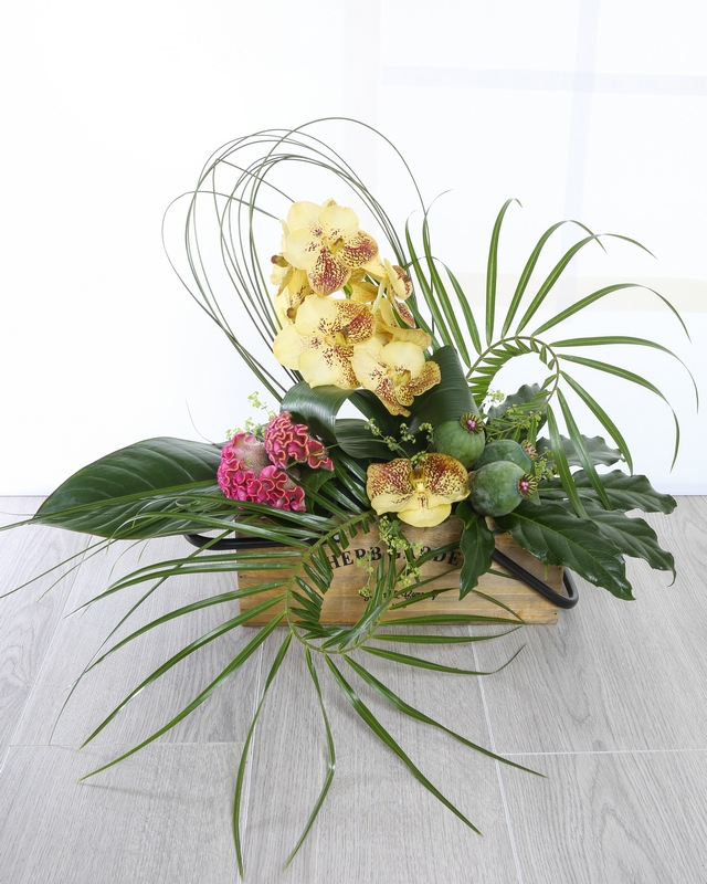 Lucina is a dramatic design, beautifully presented in a wooden planter. Including Phalaenopsis, Celosia, Leaf and Aspidistra.