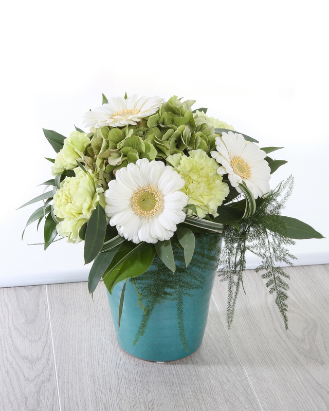 Irene contains artfully arranged Hydrangea, Carnations, Germini, Fern, Populus and China Grass to create this delicate arrangement.