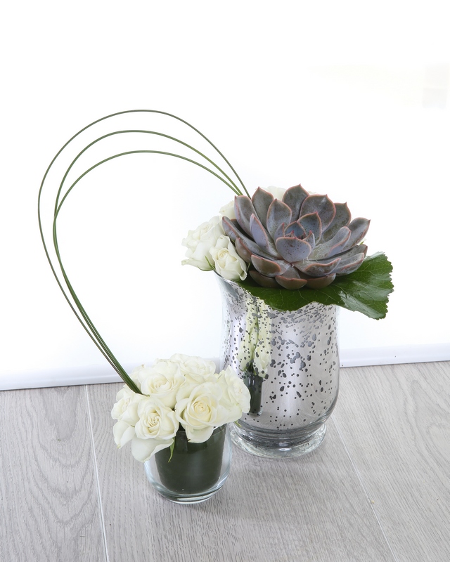A modern twist, combining Succulent, Roses and Aspidistra in this dramatic arrangement