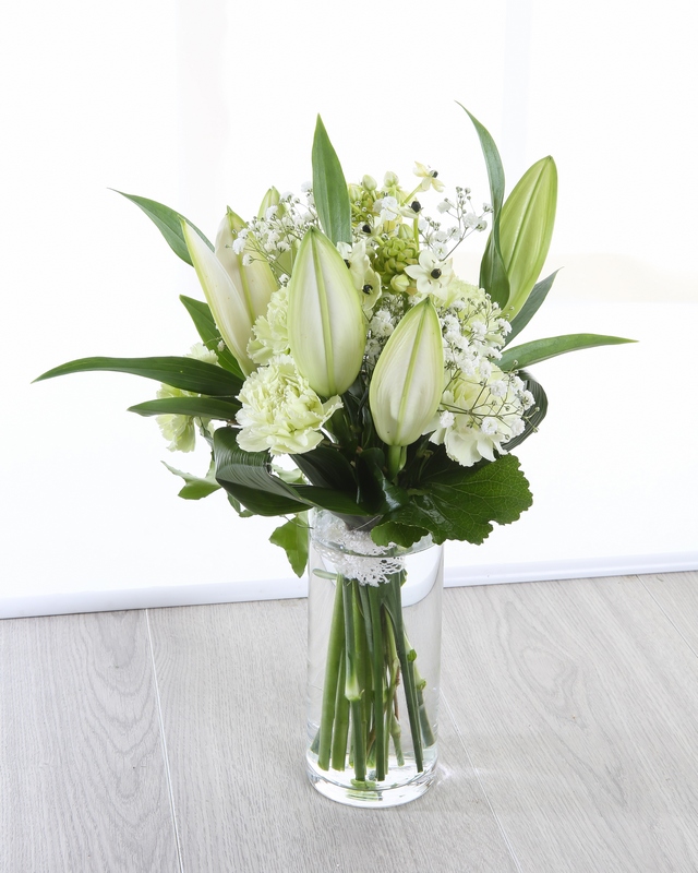 Beautiful Oriental Lilies are complemented by Carnations and fresh flowers in our perfectly white Juno arrangement