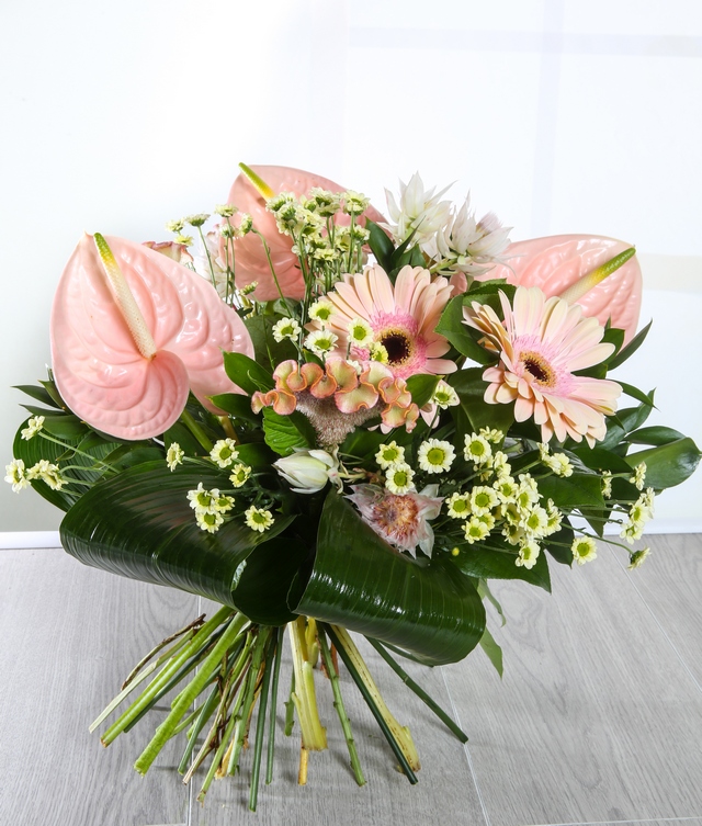 Perfect pinks and blush peach artfully arranged in our Vienna hand-tied. Fresh Anthuriums, Gerbera, Santini, Aspidistra are used to create this stunning bouquet.