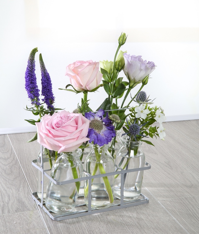 An eye-catching arrangement, keeping with the trends for small, unique designs. Using miniture milk bottles and crate and fresh flowers including Roses, Veronica and Thistle to create the look.
