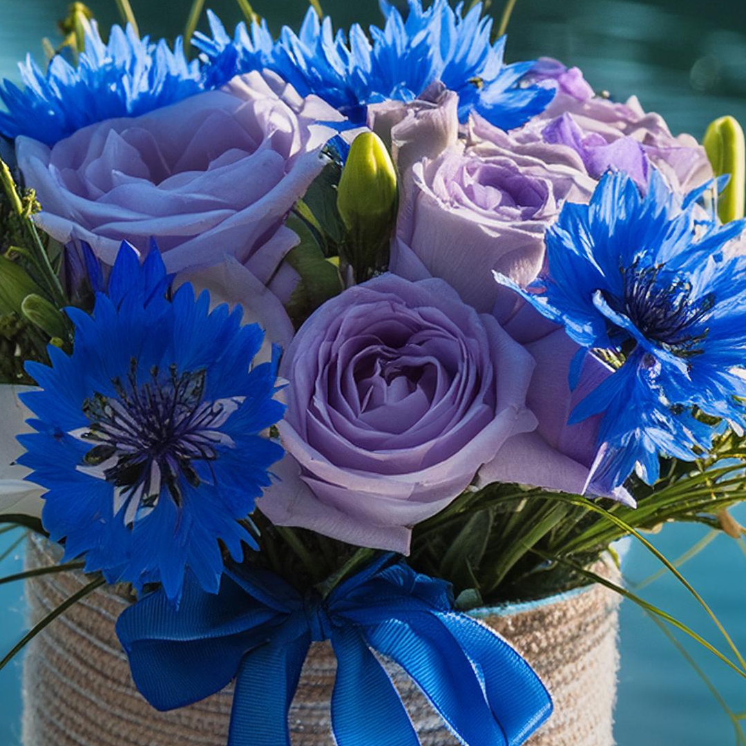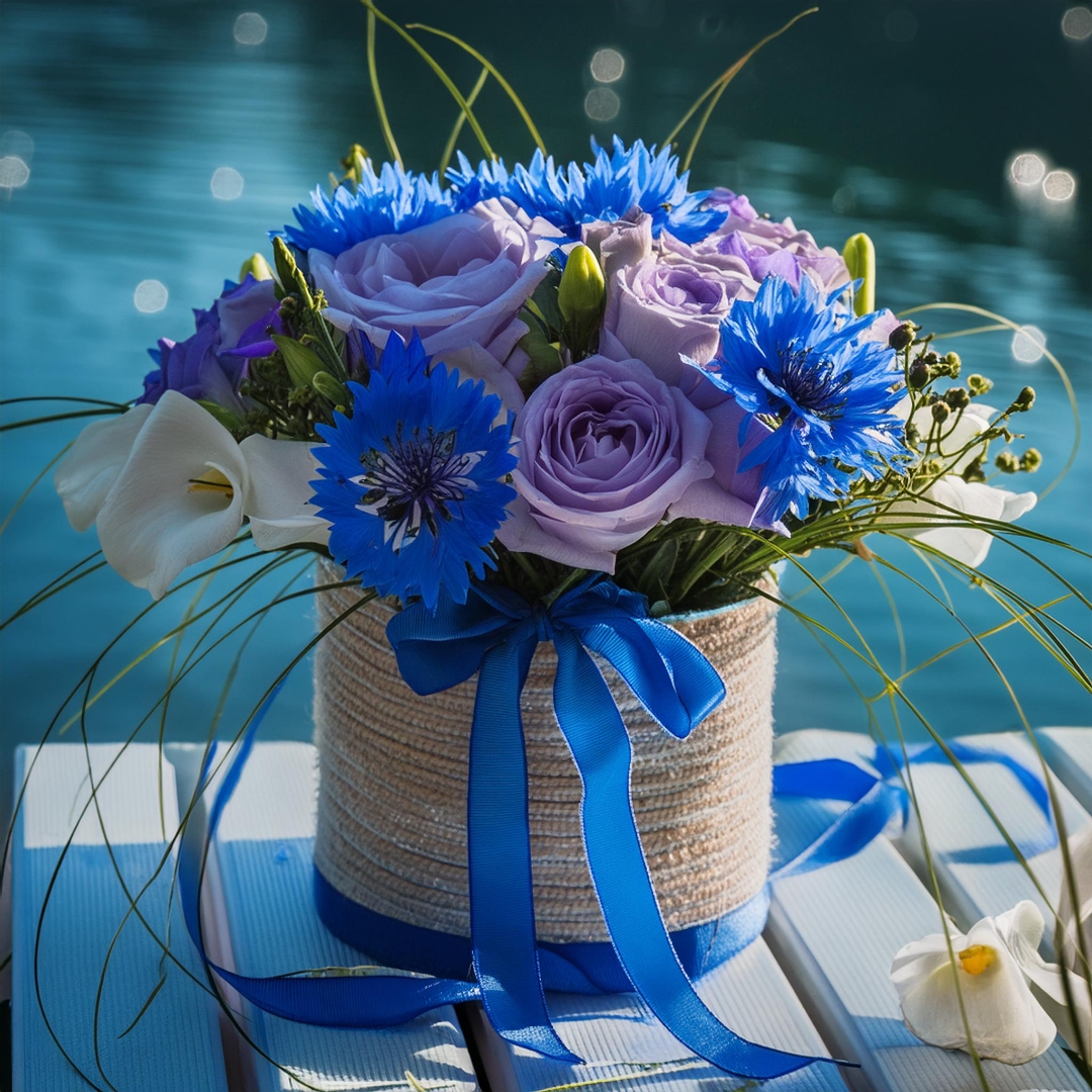 Our bouquet features the striking larkspur, with its tall, graceful spikes of blooms in shades of blue, purple, and pink, symbolizing an open heart and the celebration of life. These elegant flowers are beautifully complemented by the serene water lilies, whose broad, delicate petals float gracefully, evoking a sense of peace and purity.