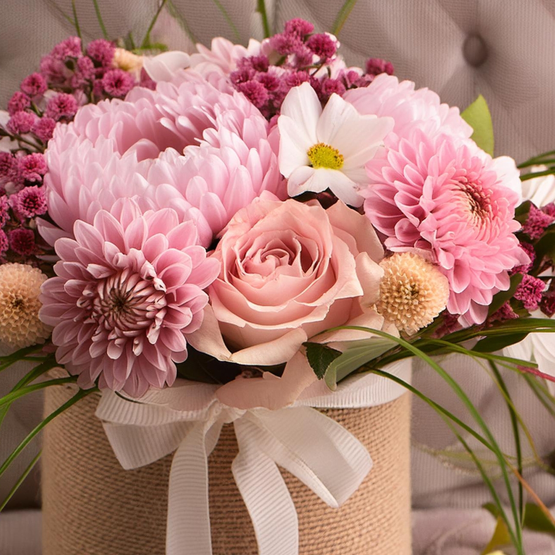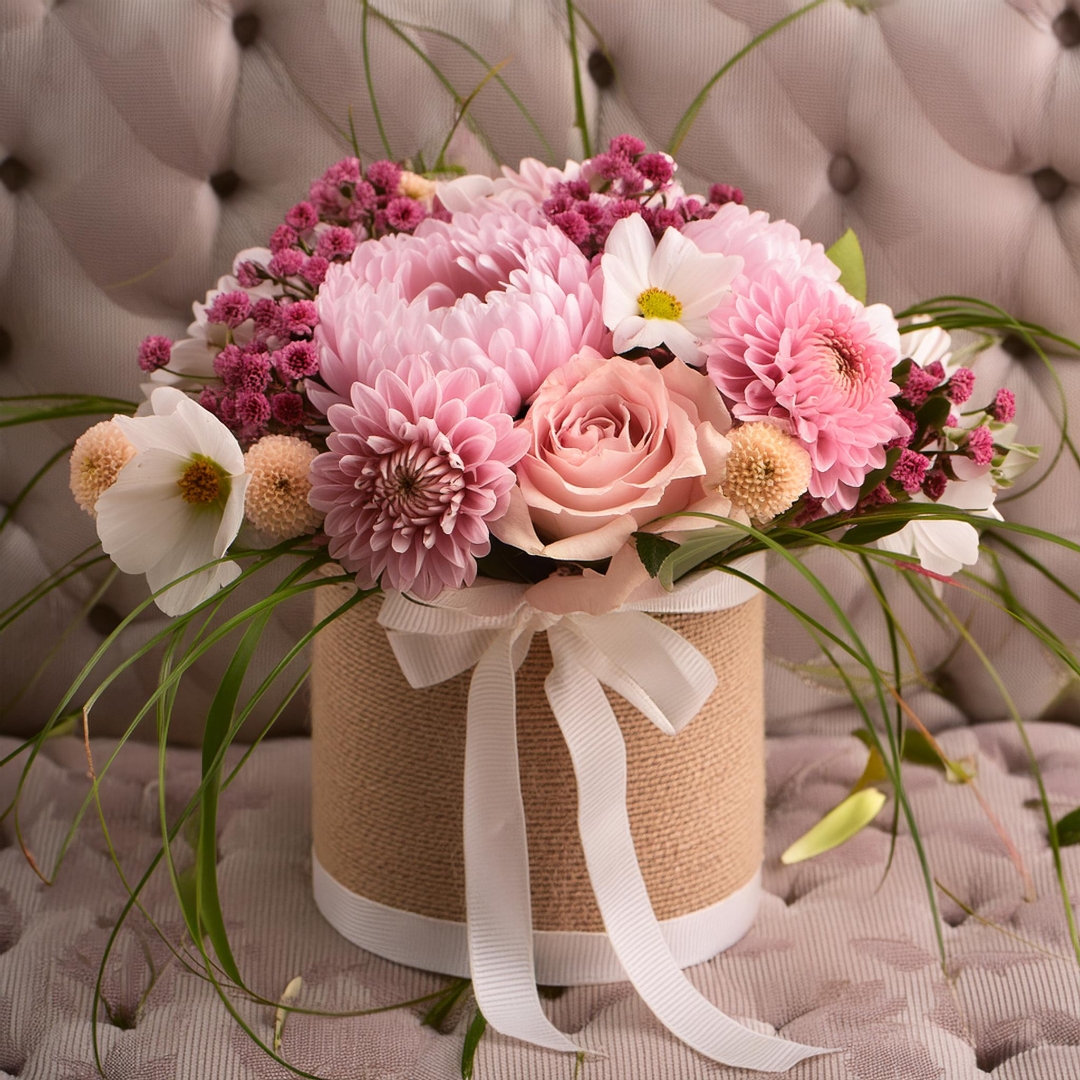 The November Bouquet is a harmonious union of textures and colors, creating a luxurious and inviting visual display. The combination of chrysanthemums' robust presence and peonies' delicate beauty evokes the cozy ambiance and rich colors of late autumn, bringing a touch of opulence and comfort to any setting.