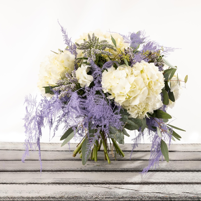 Stylish and elegant, the Sandringham bouquet has the royal seal of approval! Fluffy cream hydrangeas, purple veronica, and luxurious green foliage make a showstopping floral gift